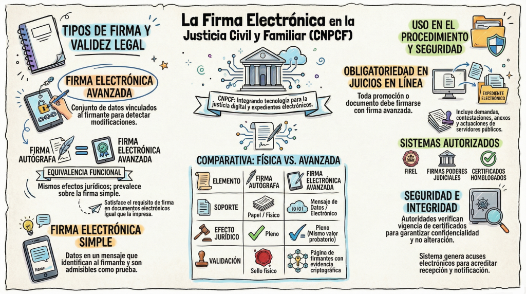 Para garantizar la seguridad y la identidad de quienes intervienen en un juicio, el Código valida el uso de la Firma Electrónica Avanzada. Esta herramienta produce los mismos efectos que la firma autógrafa y es admisible como prueba en juicio. Esto permite que demandas, promociones y resoluciones se firmen digitalmente con total certeza legal, utilizando herramientas como la e.firma o la FIREL.