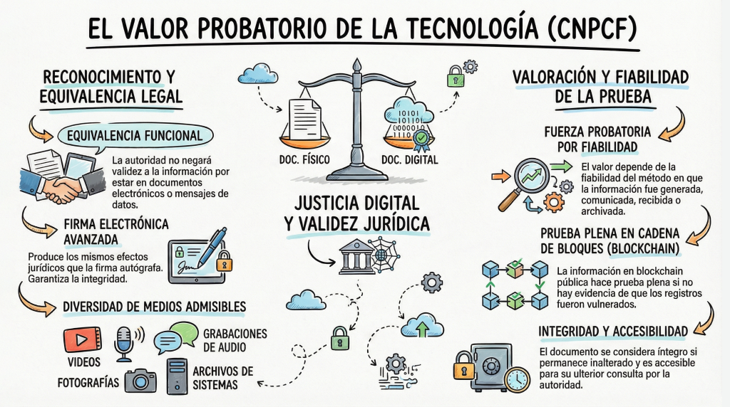 El Código establece reglas claras para que las pruebas digitales (como mensajes de texto, correos o videos) sean admitidas. Se prioriza el análisis de la fiabilidad del método en que haya sido generada, comunicada, recibida o archivada la información, asegurando que el contenido sea íntegro y accesible para su consulta posterior.